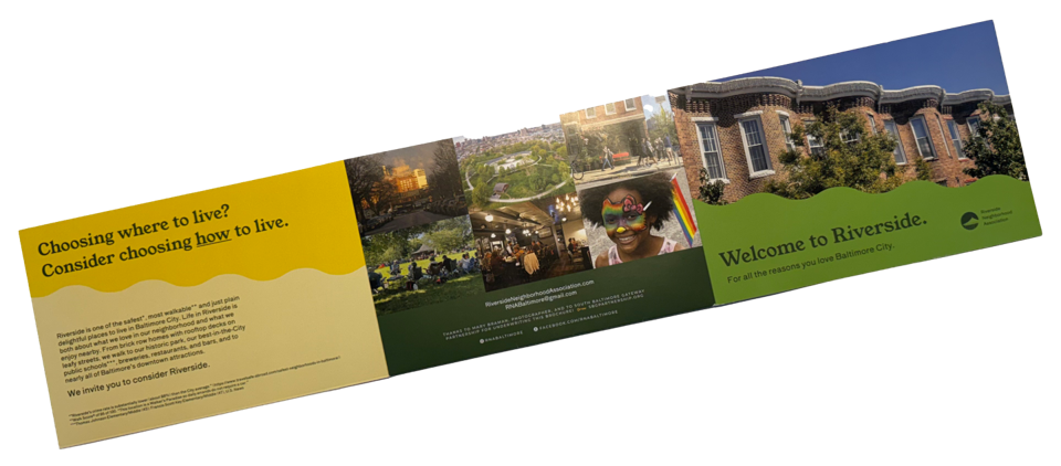 With a grant from South Baltimore Gateway Partnership and design services from the Cohere agency, the Riverside Improvement Association has brochures that speaks to the benefits of living in Riverside.
